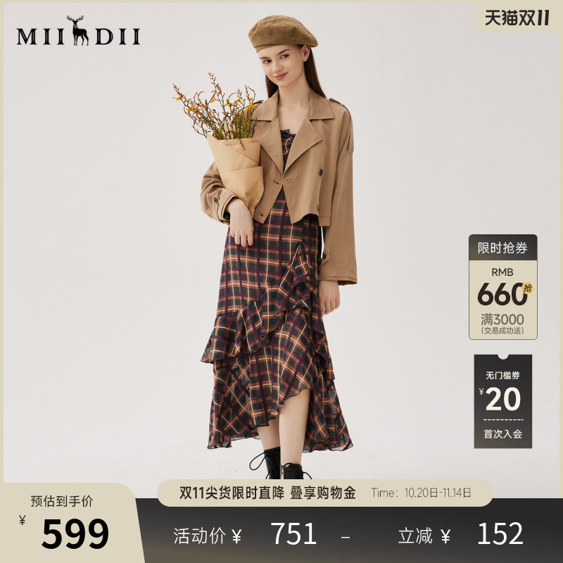 谜底格子吊带裙2024秋季新品复古浪漫荷叶边下摆连衣裙243GL1182