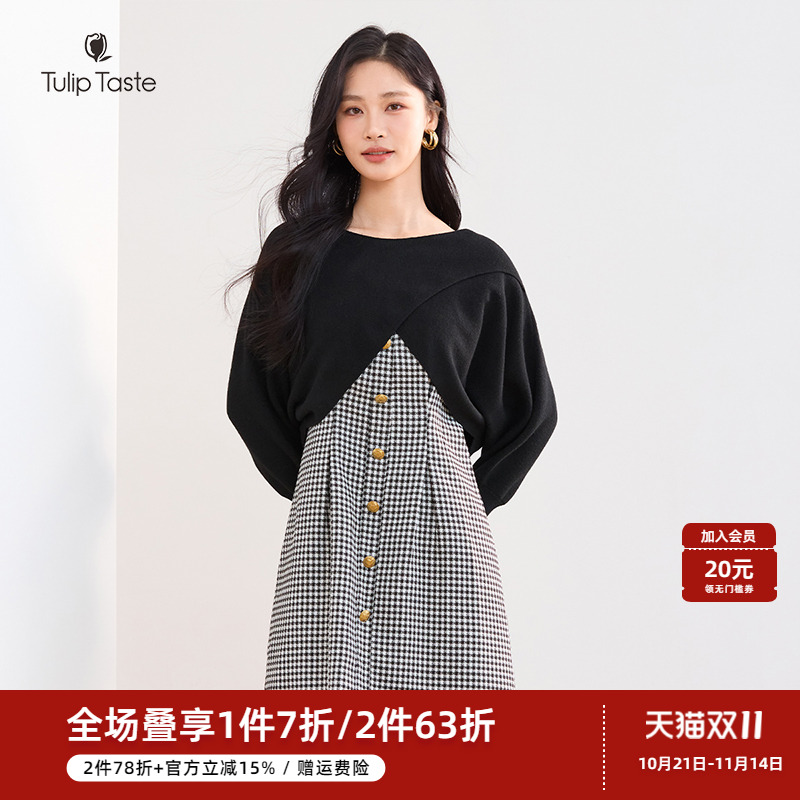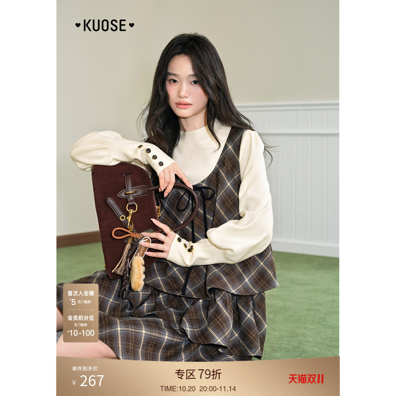 郁香菲连衣裙套装女气质通勤秋季时尚坎肩线衫+格子吊带裙两件套