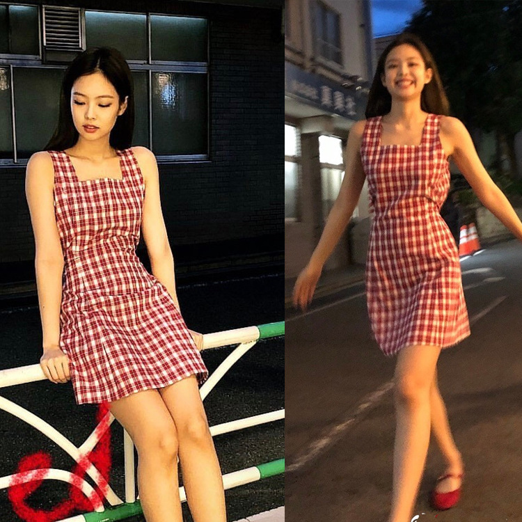 2025新款夏明星Jennie金珍妮ins同款红色格子吊带裙女连衣裙显瘦