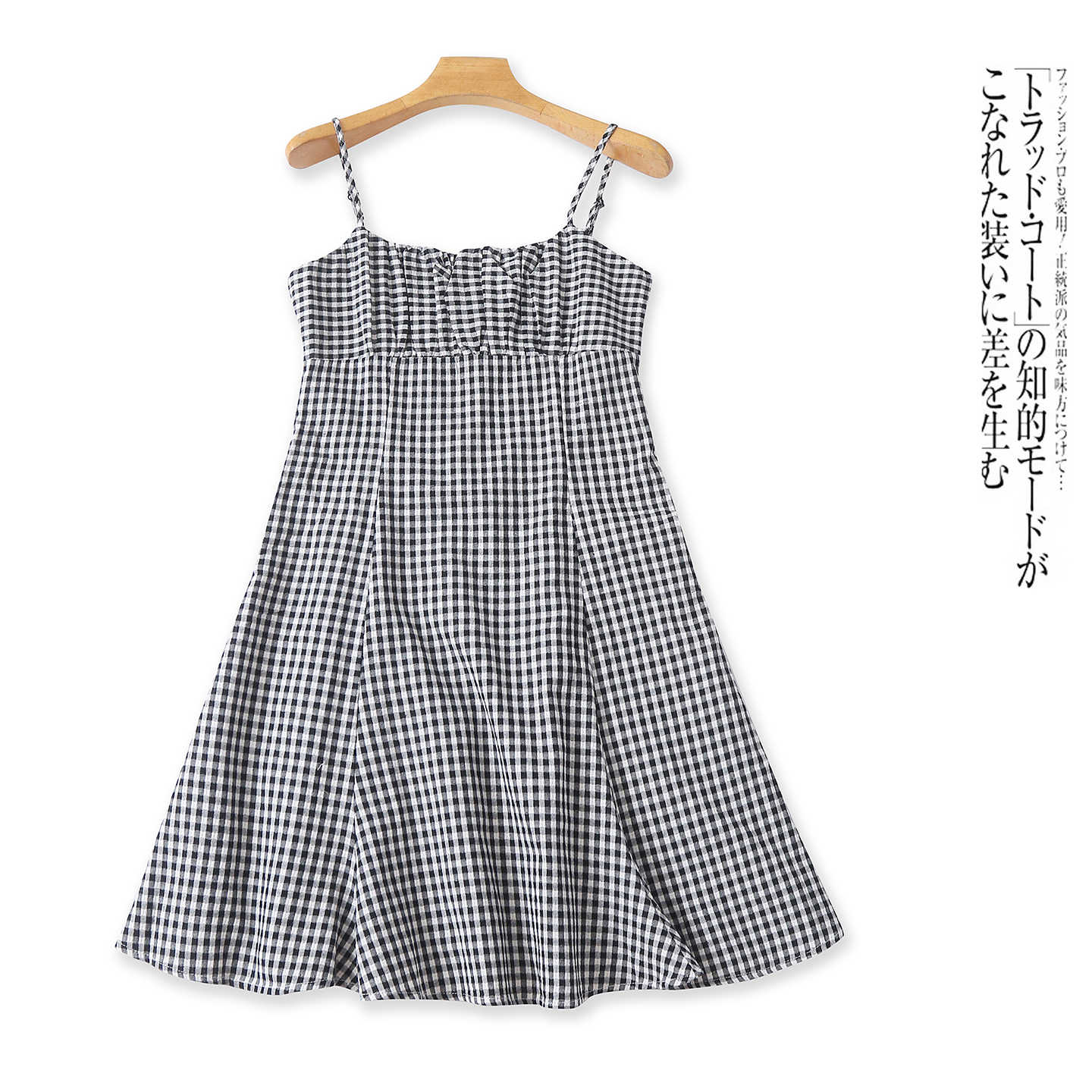 C06092日单新款GL方领有弹力松紧修身女优雅气质可调节格子吊带裙