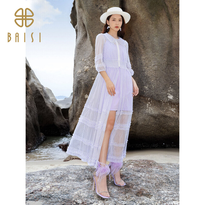 pusumede 清新田园风~ 格子吊带连衣裙女气质收腰侧开叉直筒长裙