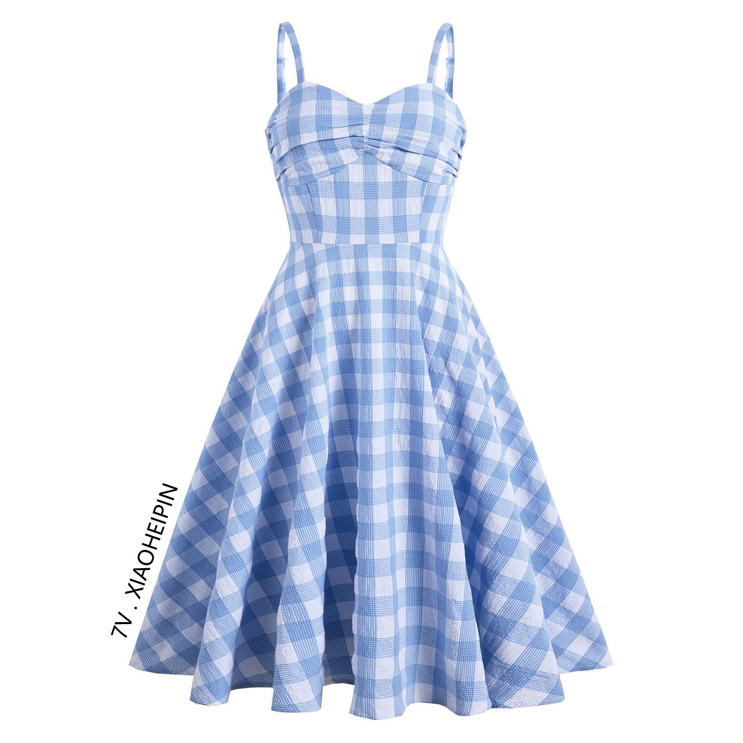 格子吊带裙 夏季新款外贸女装抹胸吊带可调节露背A字连衣裙32324