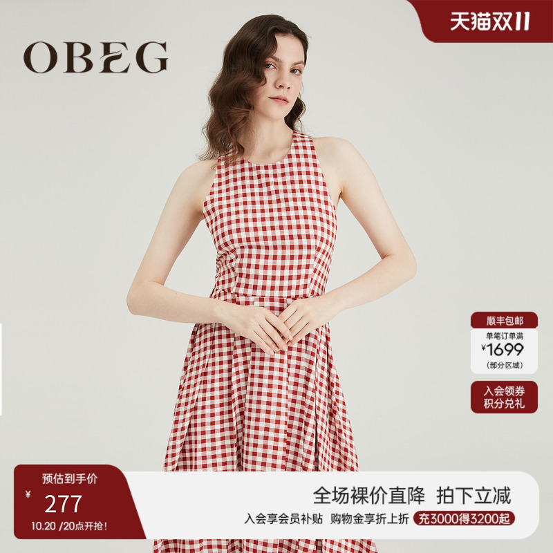 OBEG欧碧倩露背格子吊带裙秋冬收腰大摆裙无袖连衣裙10421098