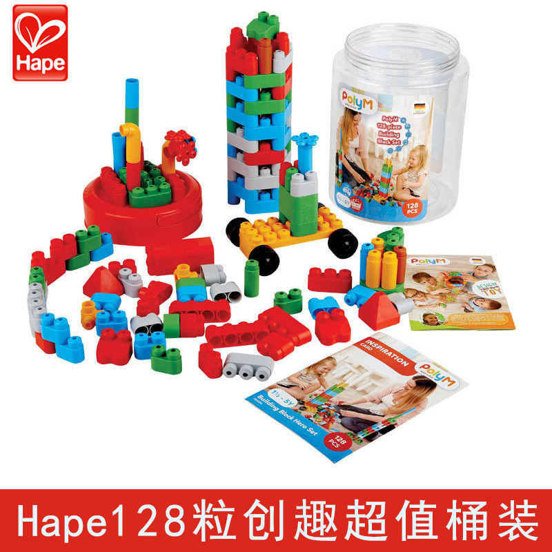 德国hape创趣超值桶装PolyM128粒儿童益智可机洗柔性塑料积木1岁+