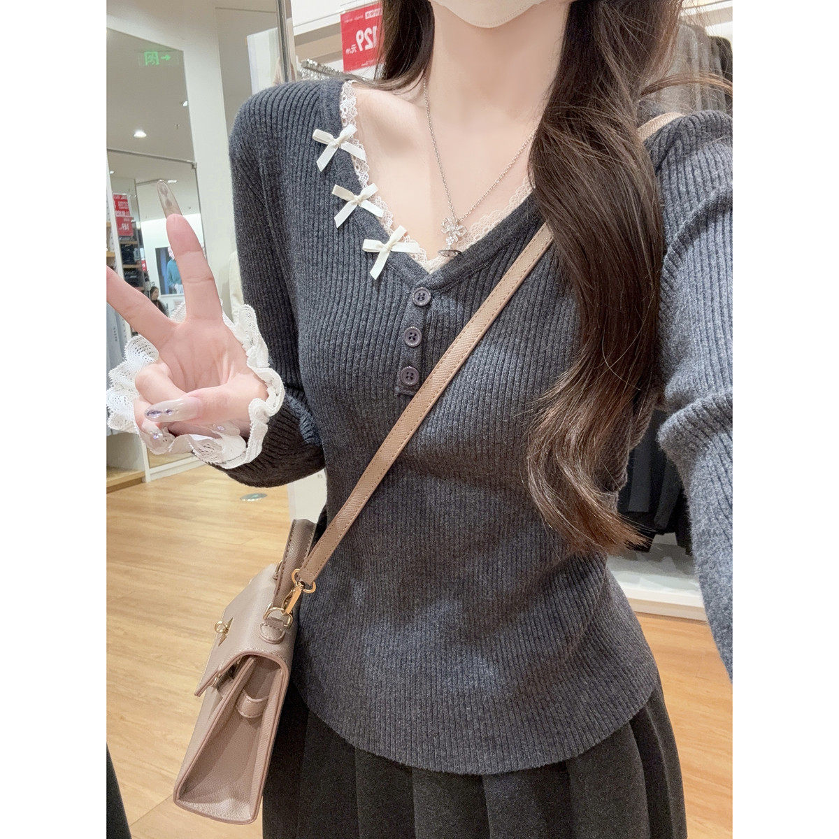 法式蕾丝花边v领蝴蝶结修身打底衫女秋冬辣妹内搭针织毛衣上衣女