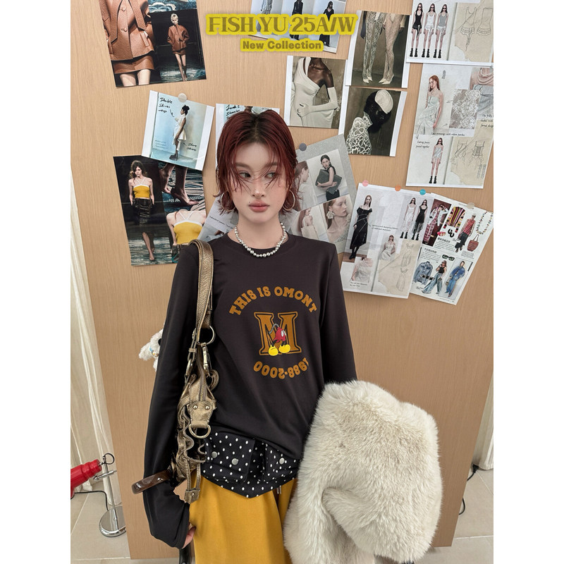 修身打底衫女2025秋冬新款M字母印花T恤复古潮流显瘦百搭时髦长袖