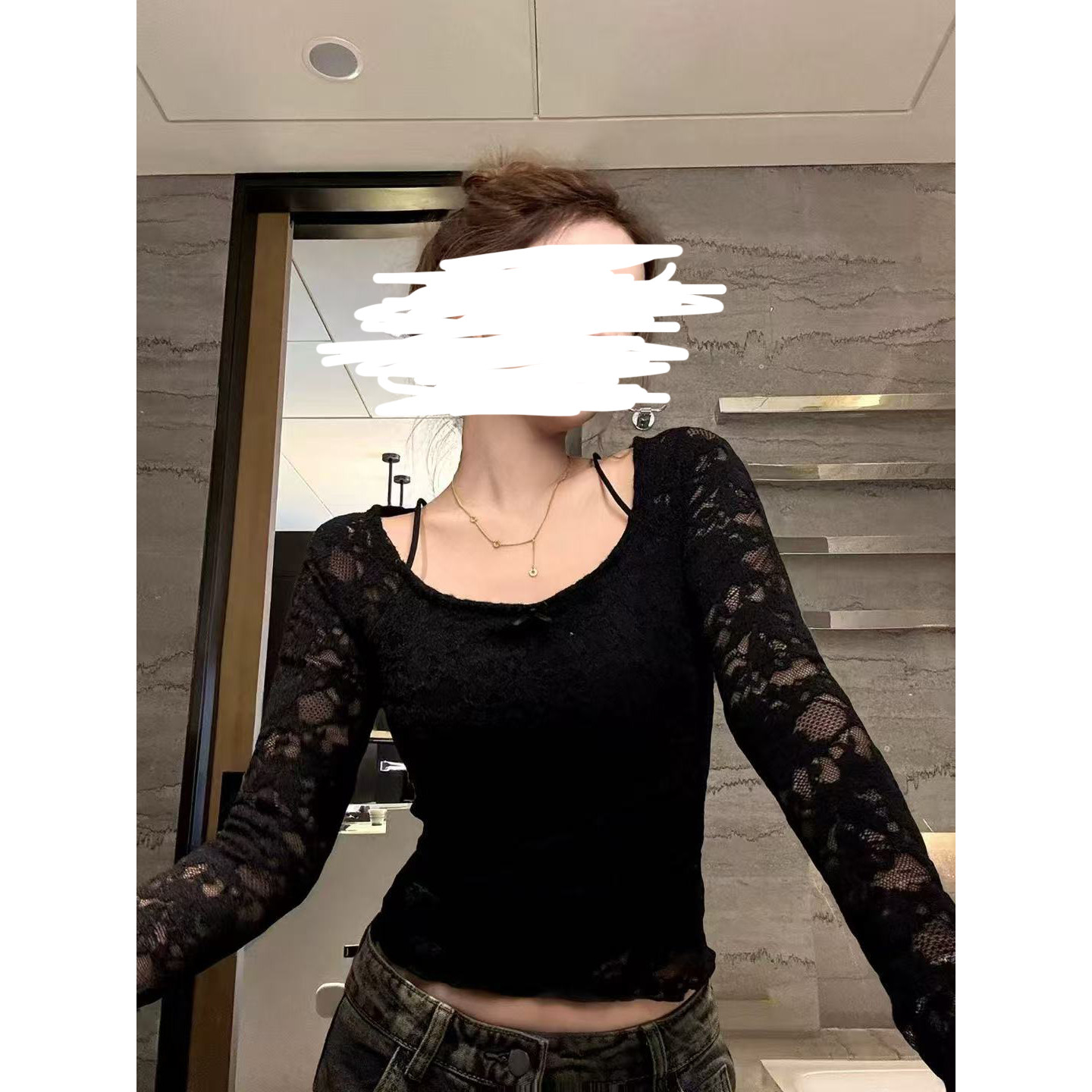 纯欲风辣妹蕾丝拼接长袖修身打底衫女2026早春大领口显瘦内搭上衣