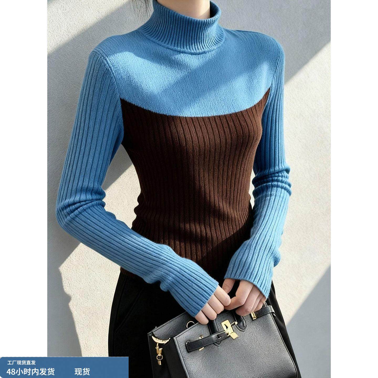 欧货高端大牌设计感撞色拼接长袖羊绒针织衫2025冬季修身打底衫女