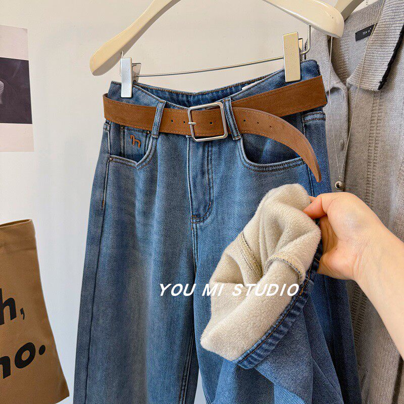 加绒巨好穿~版型超正的牛仔裤 韩国复古秋冬直筒百搭阔腿裤显瘦女
