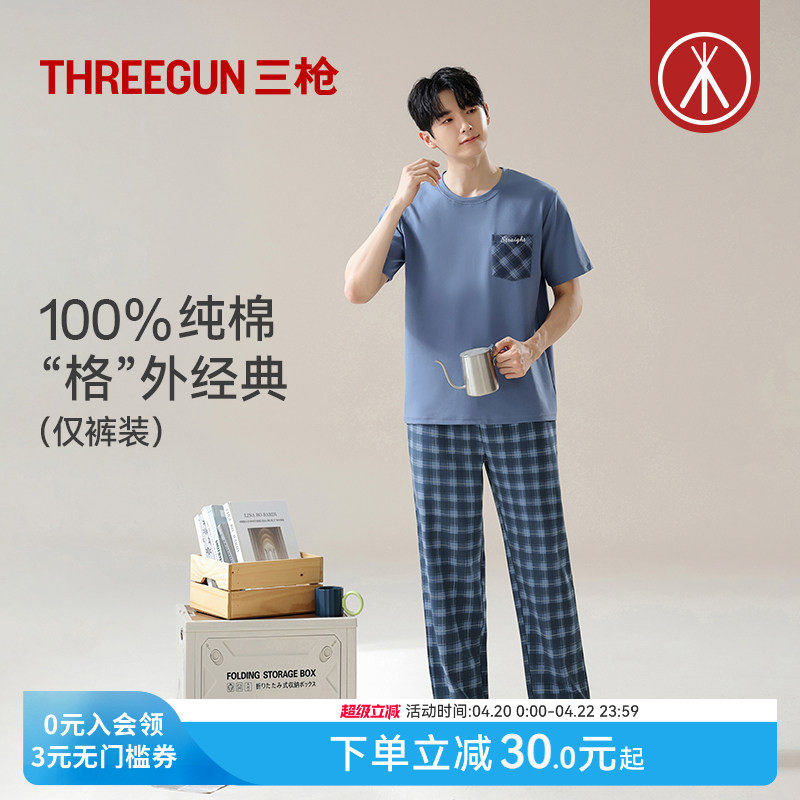 三枪2026春夏新品全棉男士睡裤水柔棉休闲格纹长裤纯棉家居裤