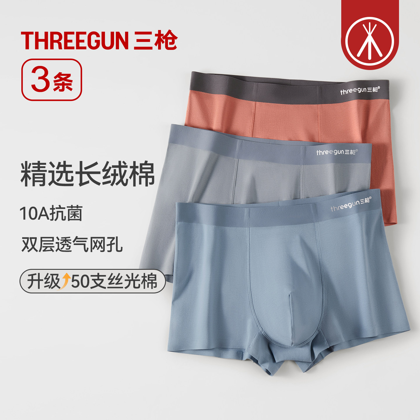 [3条]三枪内裤男50支长绒棉10A抗菌无痕平角撞色大码四角短裤新款