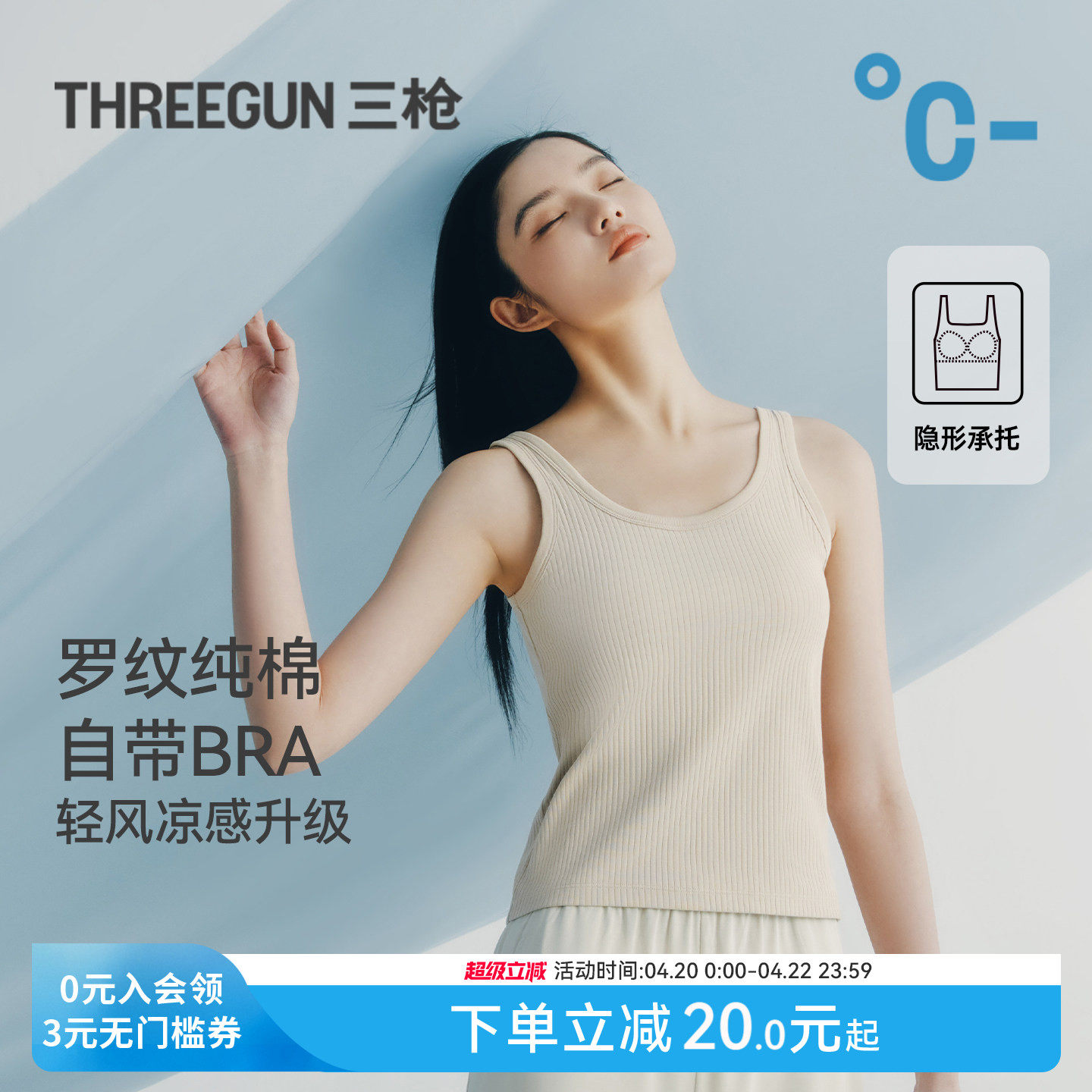 三枪背心女夏带胸垫纯棉凉感罗纹显瘦内搭文胸一体式美背吊带外穿