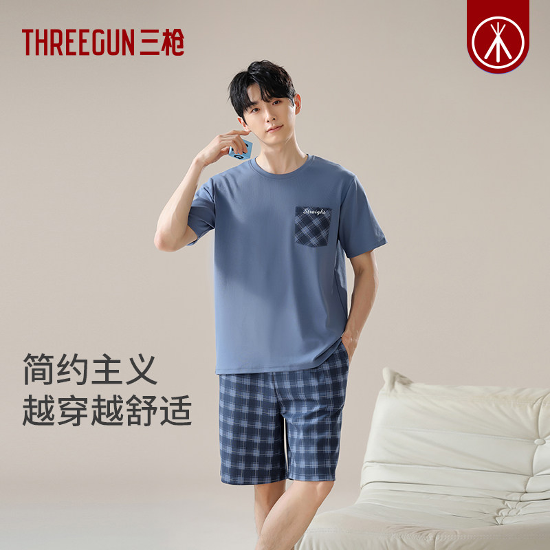 三枪夏季纯棉睡衣男短袖短裤条纹格子印花宽松休闲可外穿男家居服