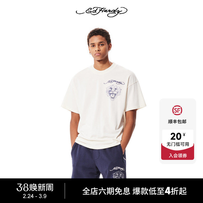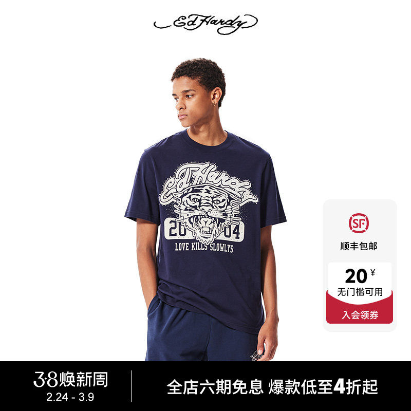 Ed Hardy埃德哈迪情侣圆领纯棉帅气薄t恤虎头美式复古潮男短袖