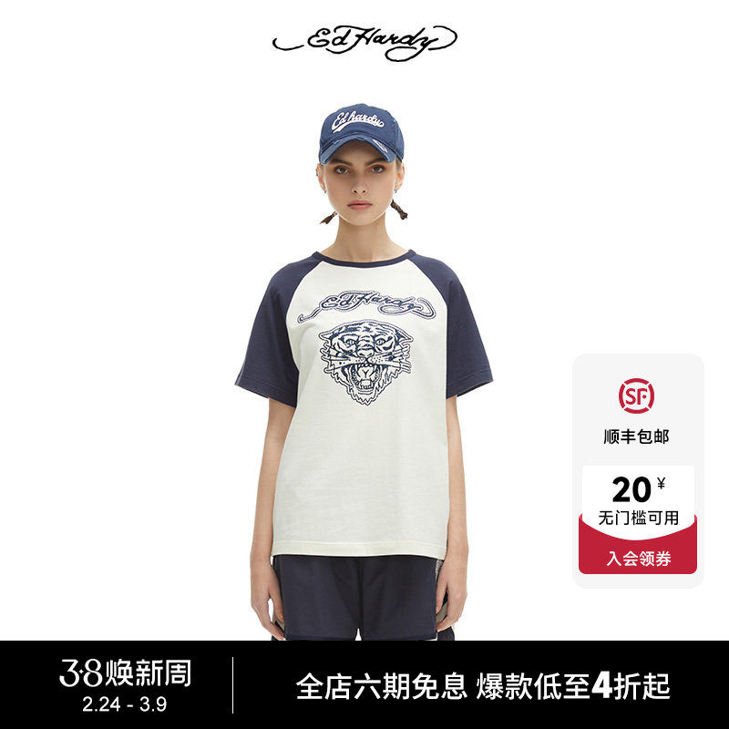 Ed Hardy埃德哈迪2026夏季新款经典虎头拼色女士短袖T恤E1STW008