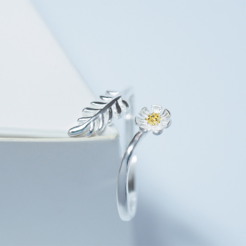 s925纯银树叶花朵开口戒小清新戒指女送闺蜜简约韩版森系学生指环