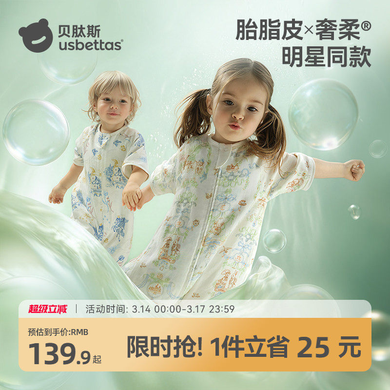 贝肽斯[胎脂皮]婴儿睡袋薄款春夏四季通用纱布儿童宝宝分腿防踢被