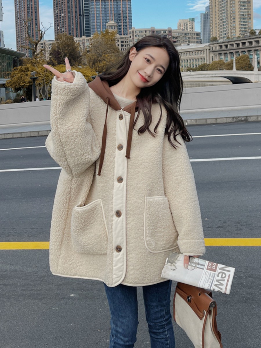 日系软妹可爱风小熊头连帽毛茸茸宽松羊羔毛绒外套女秋冬加绒加厚