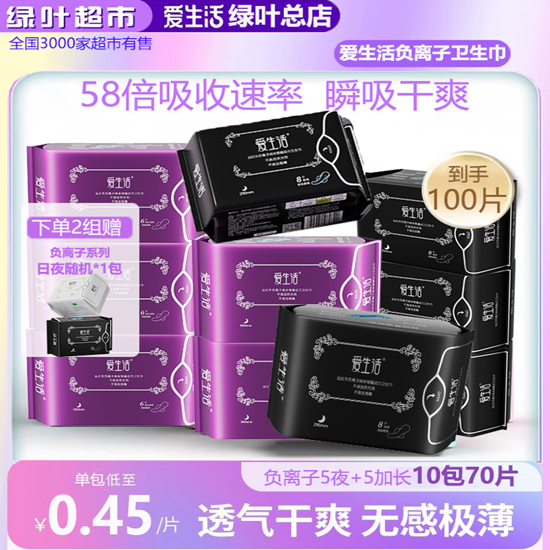 绿叶爱生活负离子卫生巾10包夜用加长混合装姨妈巾超薄柔棉亲肤干