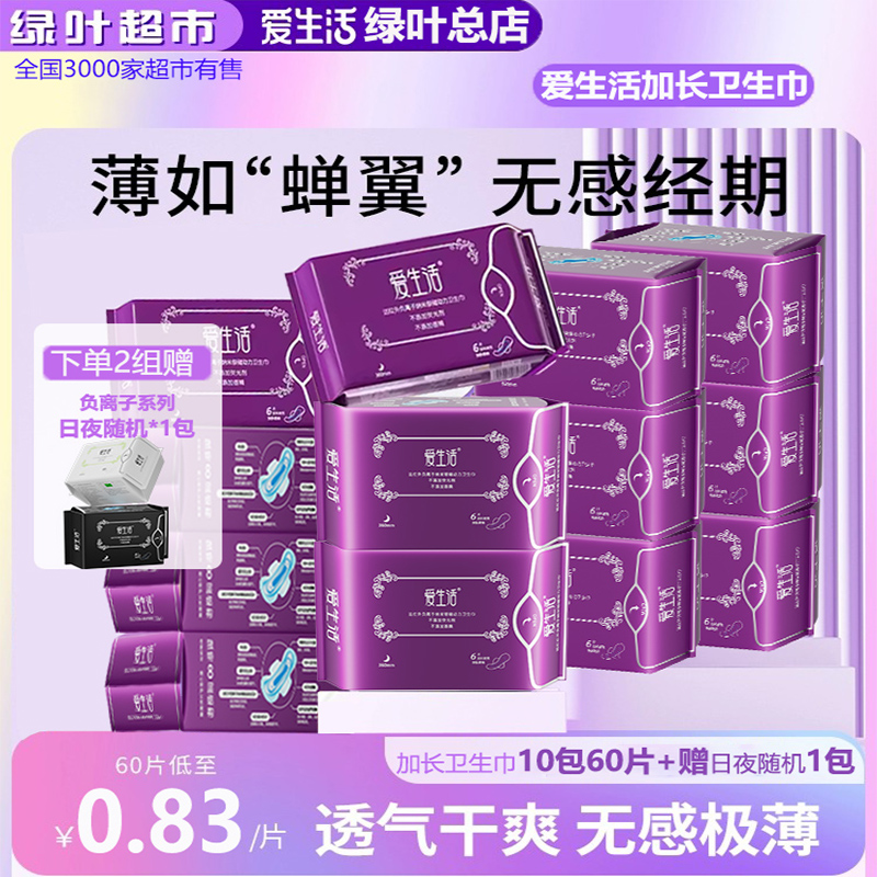 绿叶爱生活卫生巾日用夜用组合装超薄棉柔负离子防侧漏姨妈巾整箱