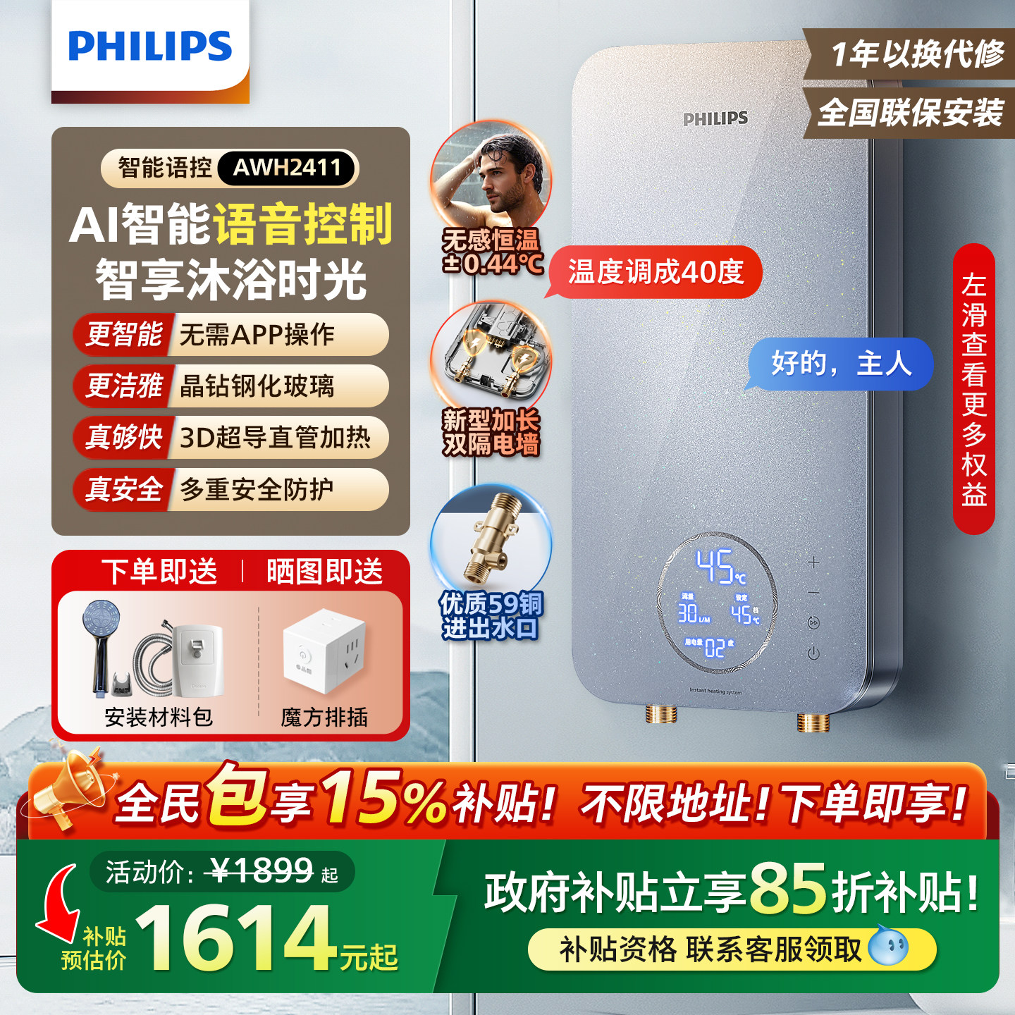 【国补15%】飞利浦即热式电热水器洗澡变频语音智控速热电热水器