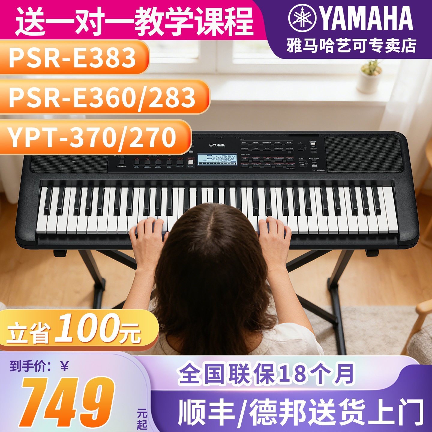 雅马哈电子琴官方旗舰店e383儿童家用初学者61键力度便携式e283