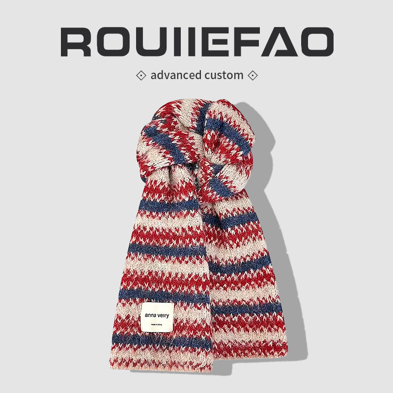 韩系红色条纹针织围巾女冬季新年氛围感羊毛加厚护颈红白围脖配饰