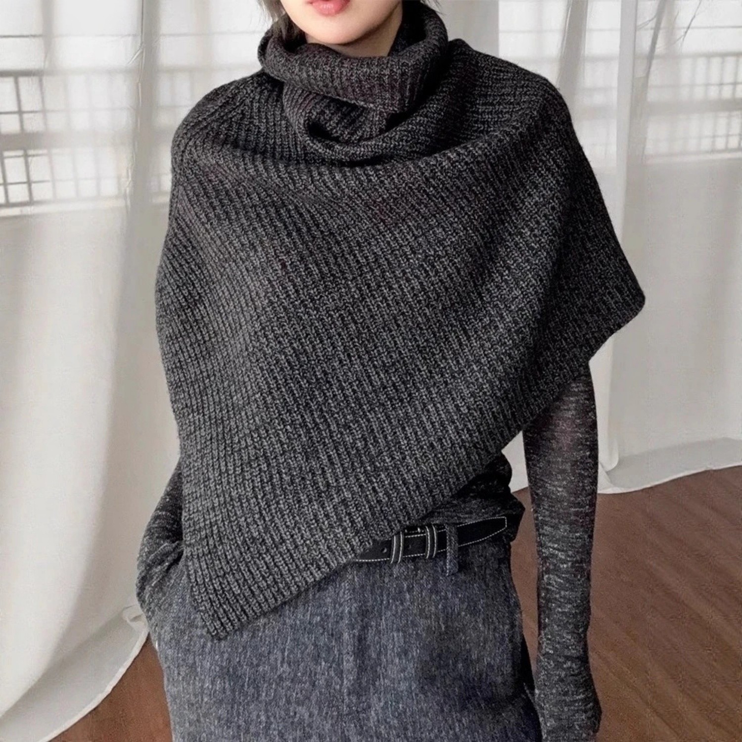 冬季女深灰色高领针织围巾高级感叠穿开叉披肩斗篷围披肩围脖加厚