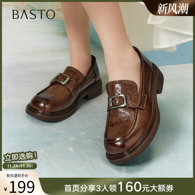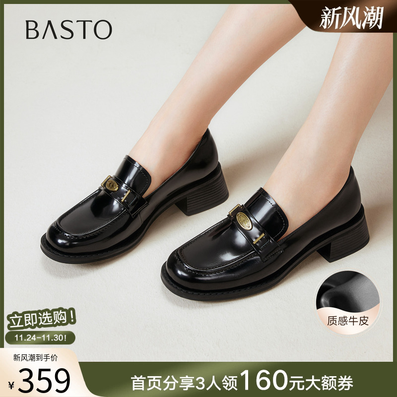 百思图2025秋季新款牛皮英伦风乐福鞋粗跟小皮鞋女单鞋C5851CA5