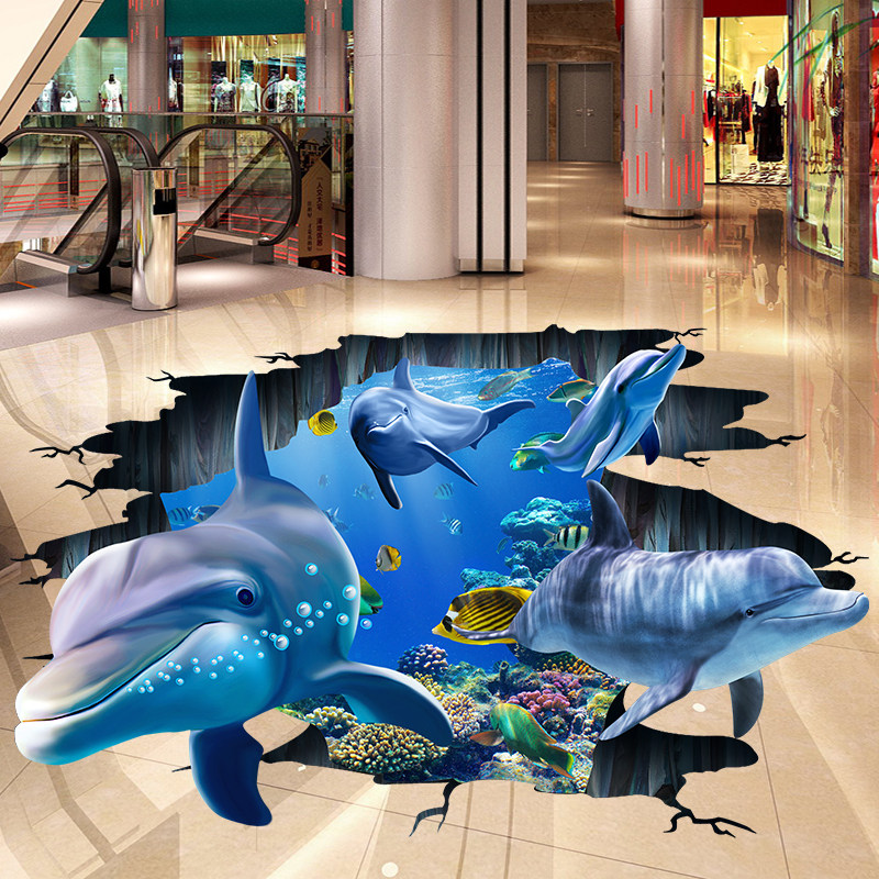3d立体地画海豚海底鱼群墙贴防水地板贴儿童房卧室客厅墙贴纸贴画