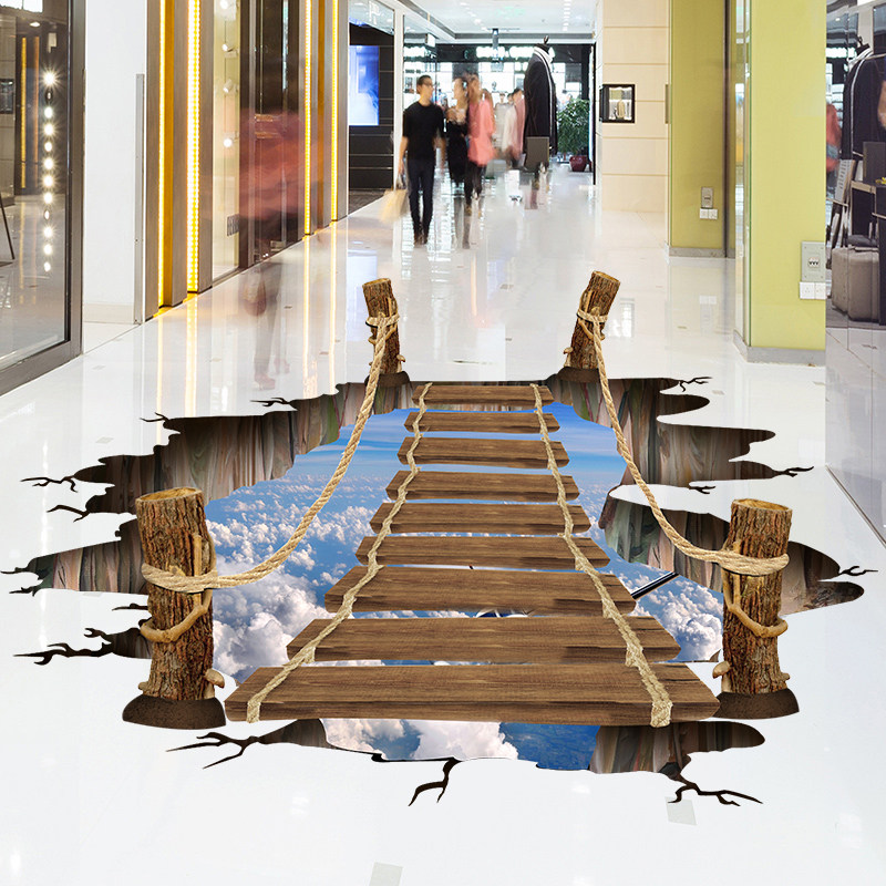 地贴蓝天瀑布木桥立体3D墙贴防水地板贴儿童房卧室客厅墙贴贴画
