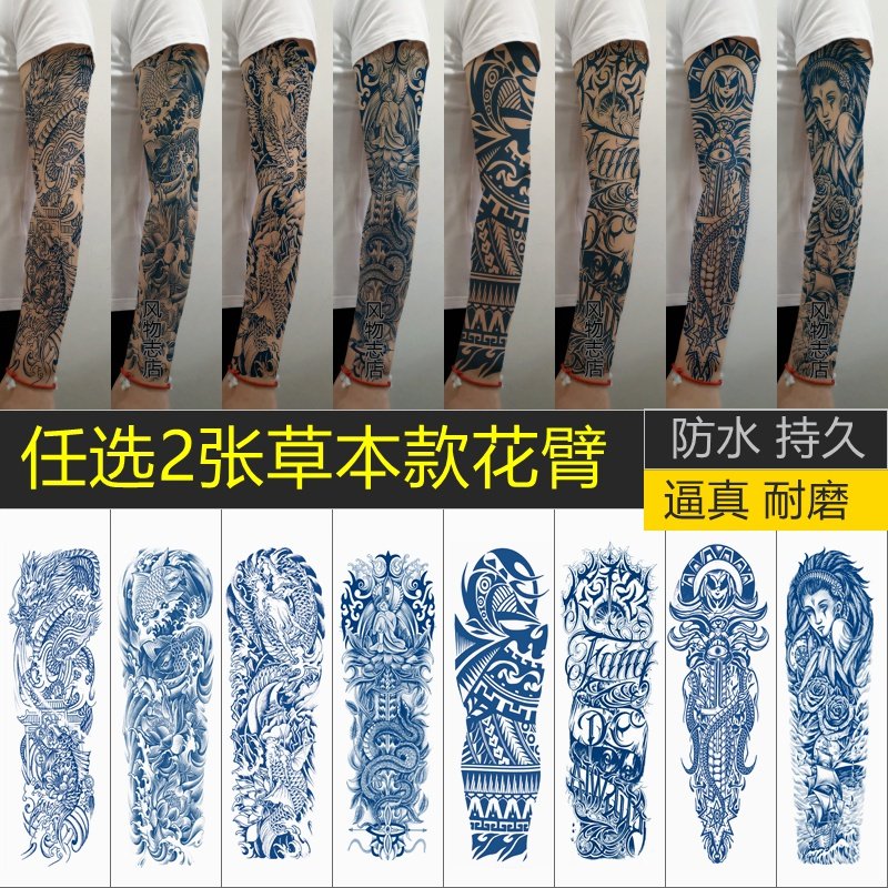 新品2张草本纹身贴男女防水 持久花臂逼真不反光果汁全臂刺青龙臂