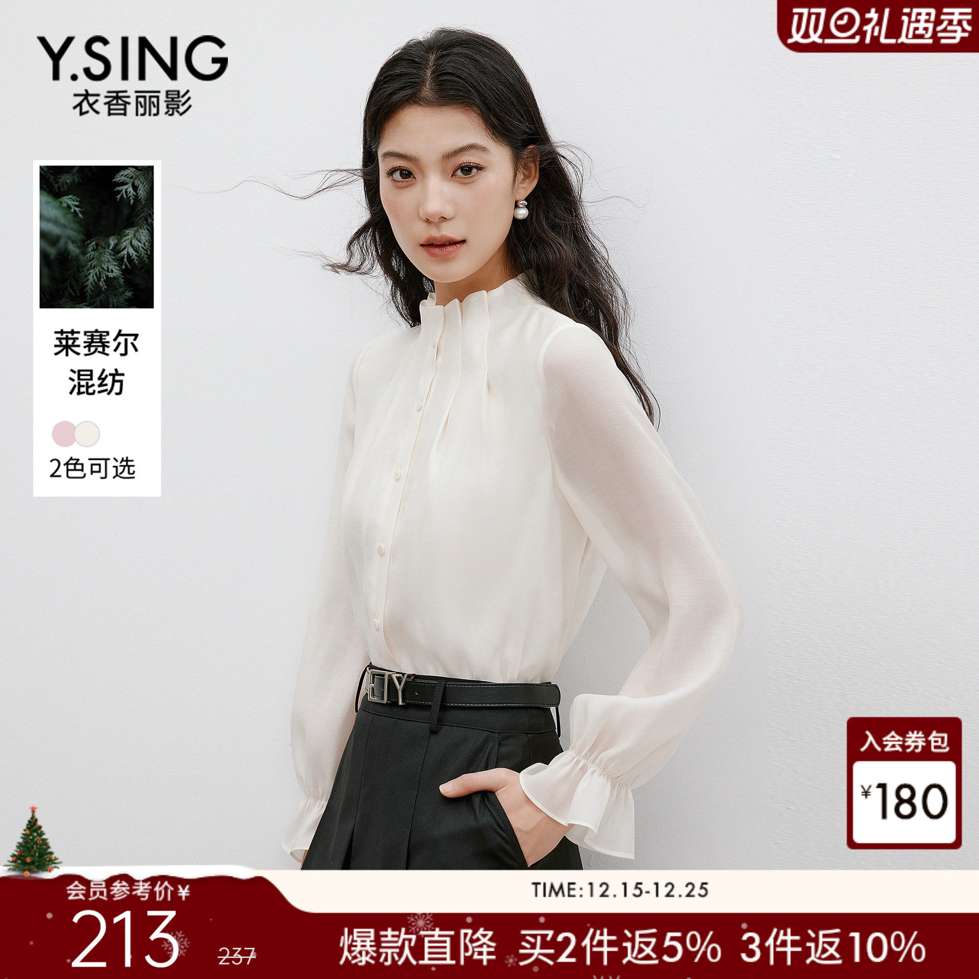 秋水伊人奥莱双层木耳边立领衬衣秋秋新款女装气质雪纺衬衫女上衣