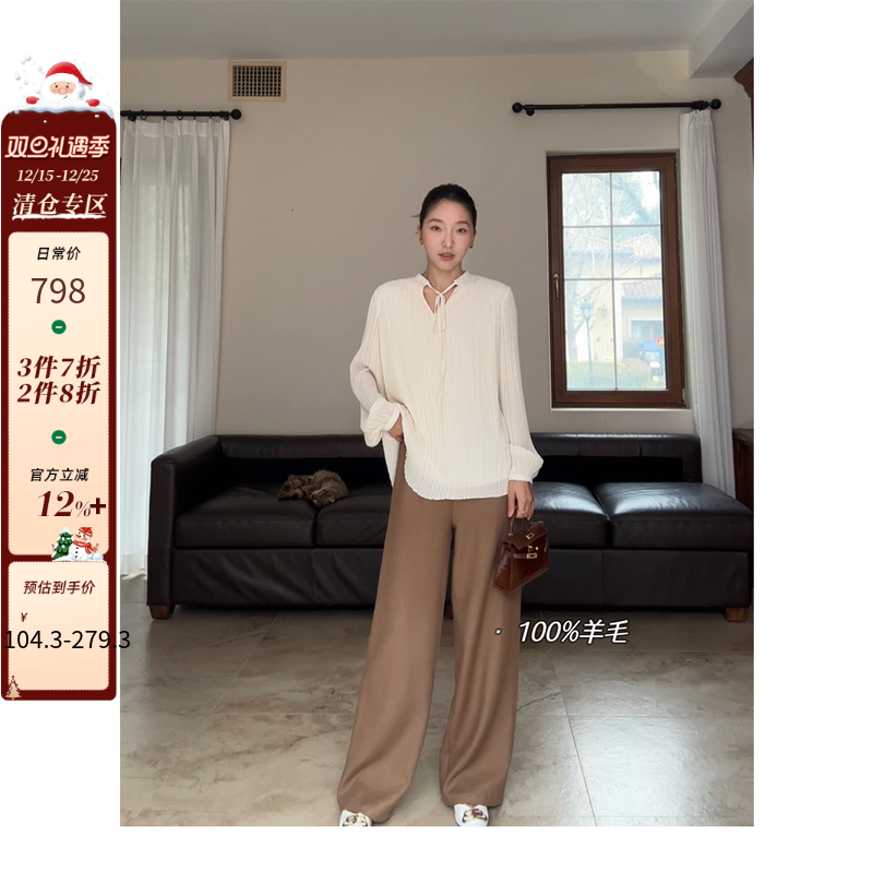郭九九呢 气质小立领重工压褶雪纺衬衫百搭上衣全羊毛宽松休闲裤