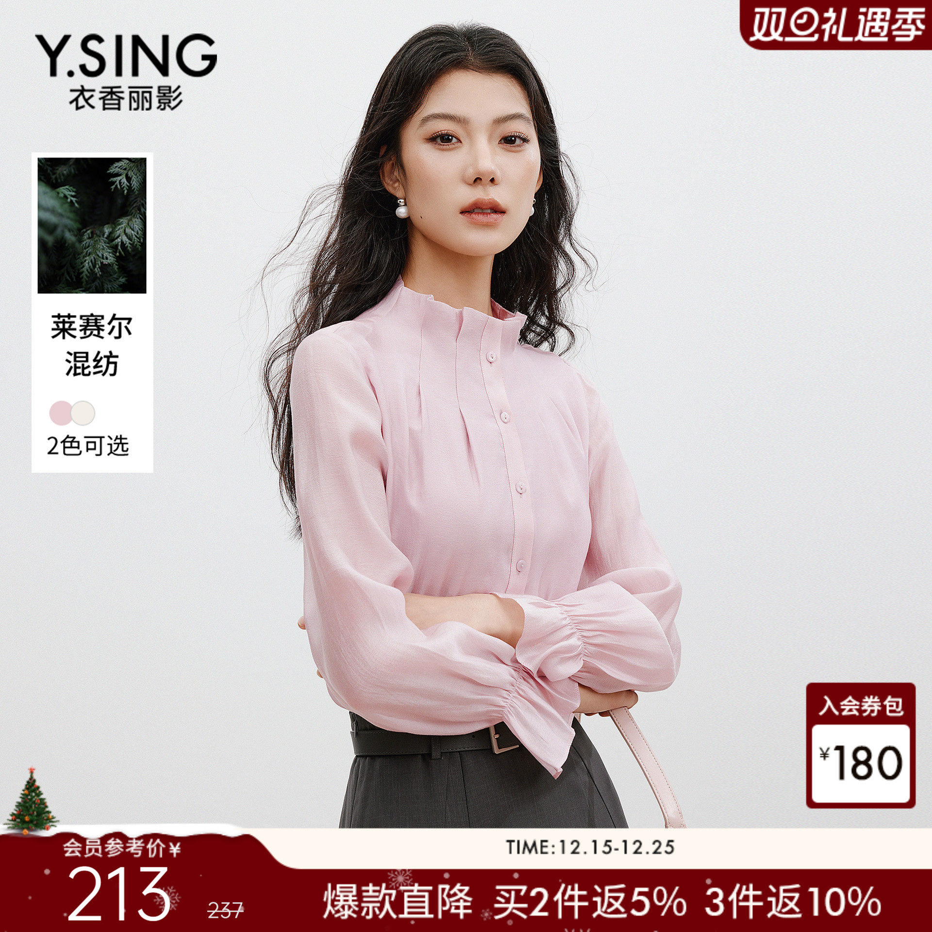衣香丽影粉色立领雪纺衬衫女2025秋冬装新款设计感花苞袖天丝上衣