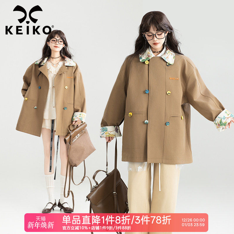 KEIKO 文艺感提花翻领廓形风衣女25秋季新款设计感异色双排扣外套