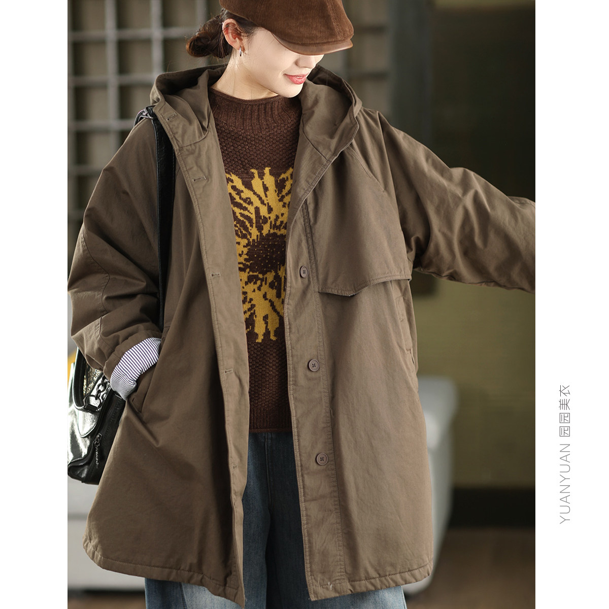 园园美衣冬季100%棉夹棉风衣外套女时尚连帽中长款加厚棉袄棉服