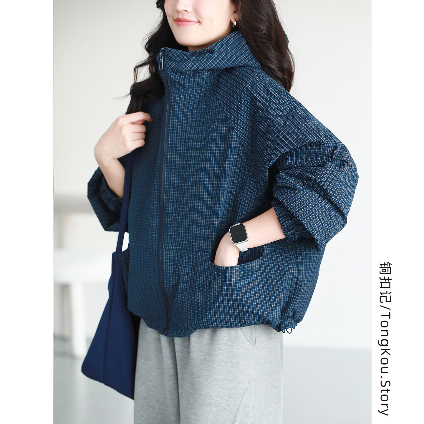 铜扣记夹棉格子外套女连帽休闲百搭宽松显瘦冬季新款加厚保暖风衣