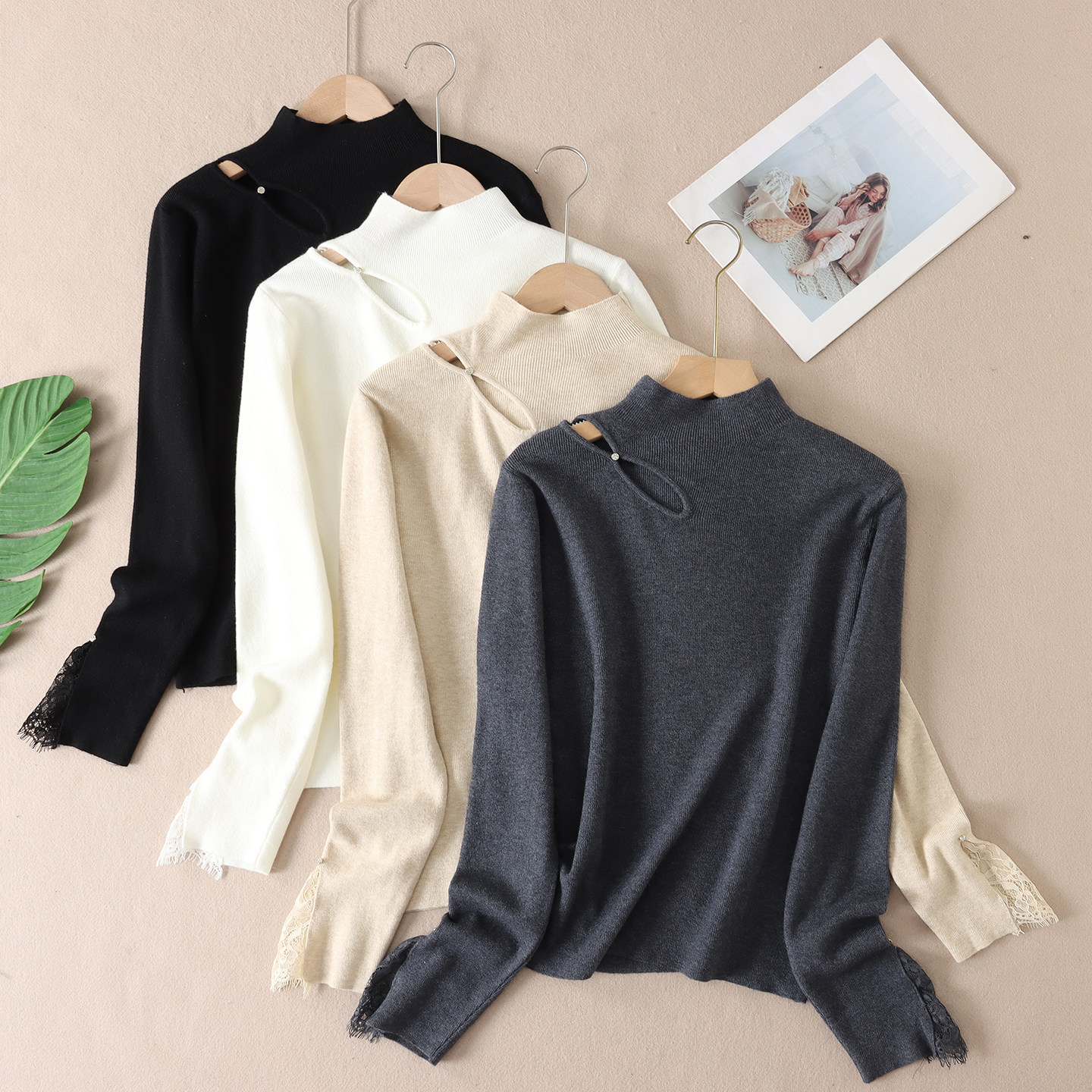 敲好看水钻镂空毛衣女冬时尚修身显瘦半高领蕾丝针织打底衫 WA69