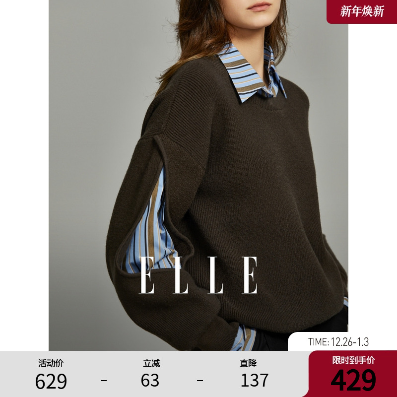 ELLE设计感假两件拼接镂空毛衣女2025冬装新款通勤风简约毛针织衫