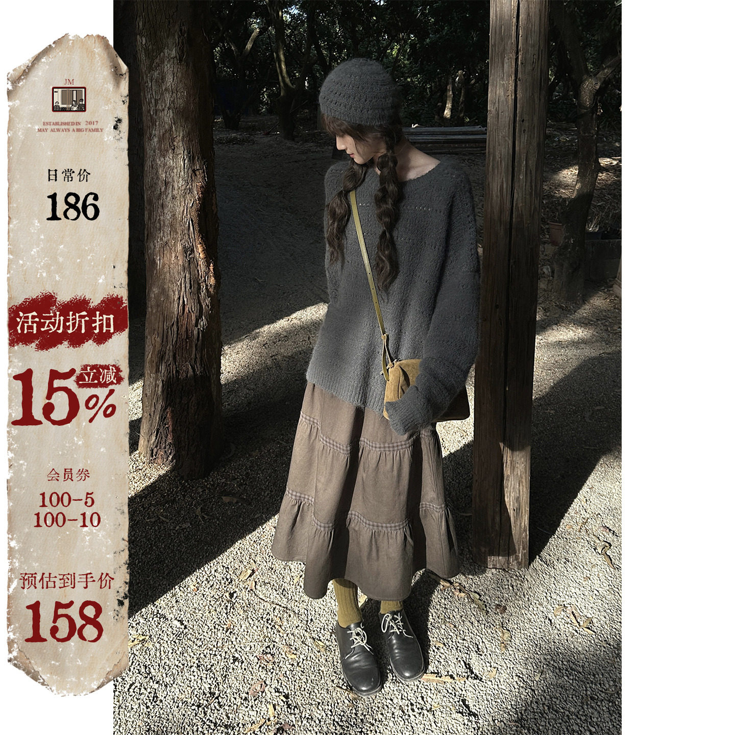 JMWOMEN送毛线帽 苔藓灰复古慵懒微镂空毛衣女冬加厚宽松软糯上衣