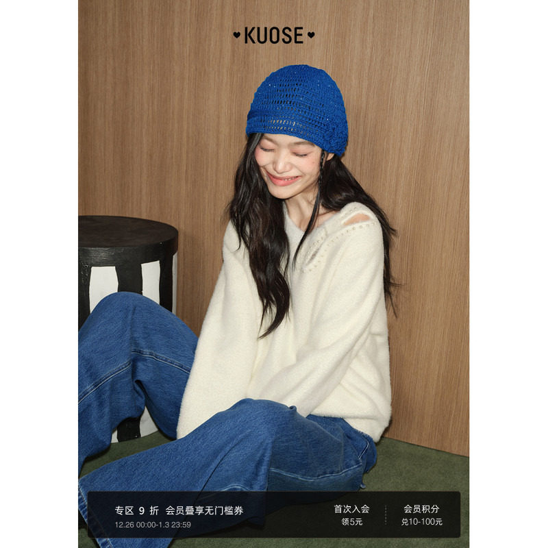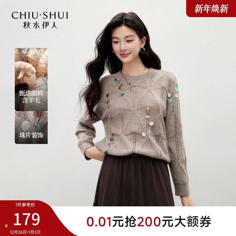 秋水伊人圆领毛针织衫2025年冬季新款女百搭宽松珠片镂空毛衣上衣