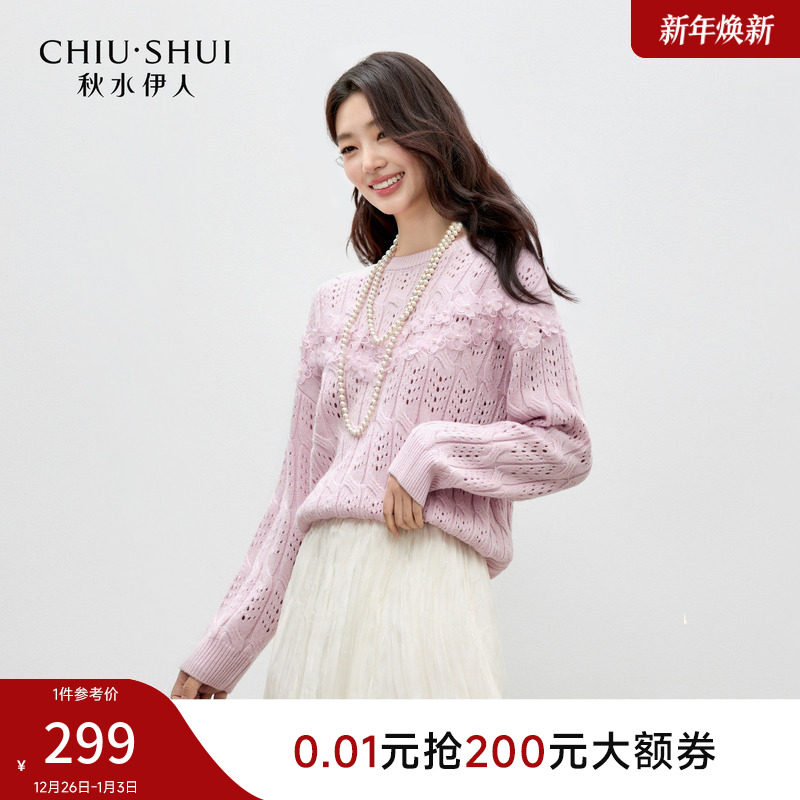 秋水伊人粉色镂空毛衣女 2026年春季新款立体花饰圆领针织衫上衣