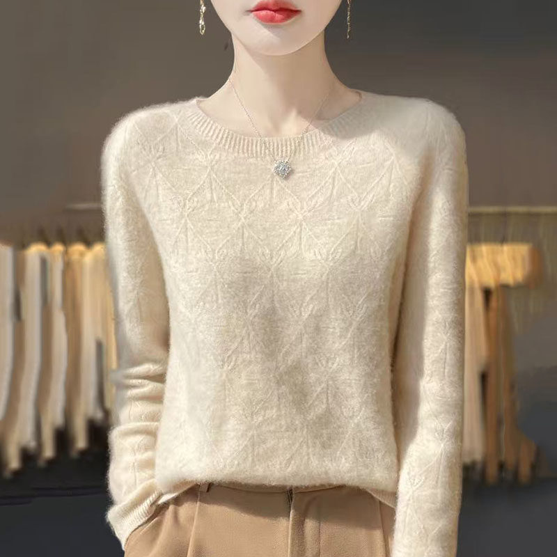 2025年羊毛衫女一线成衣圆领菱形镂空毛衣宽松羊绒衫扭花打底上衣