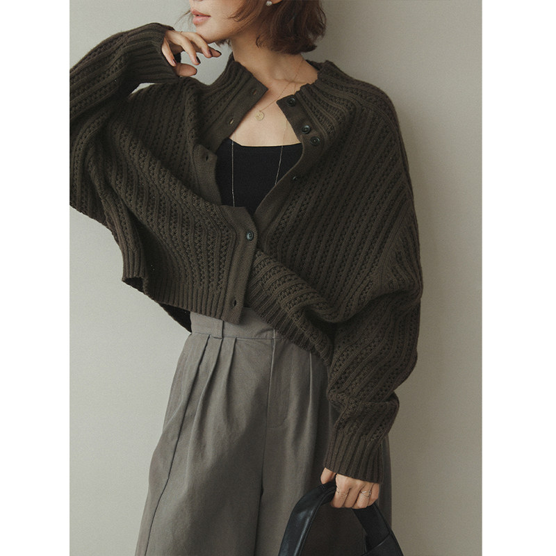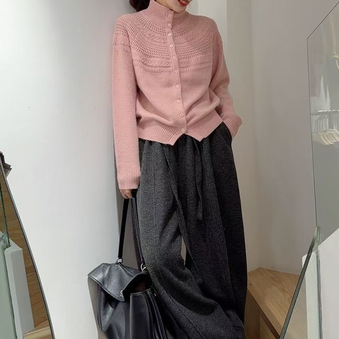 BADX正品韩版简约温柔系镂空毛衣女2025冬季超好看半高领针织开衫