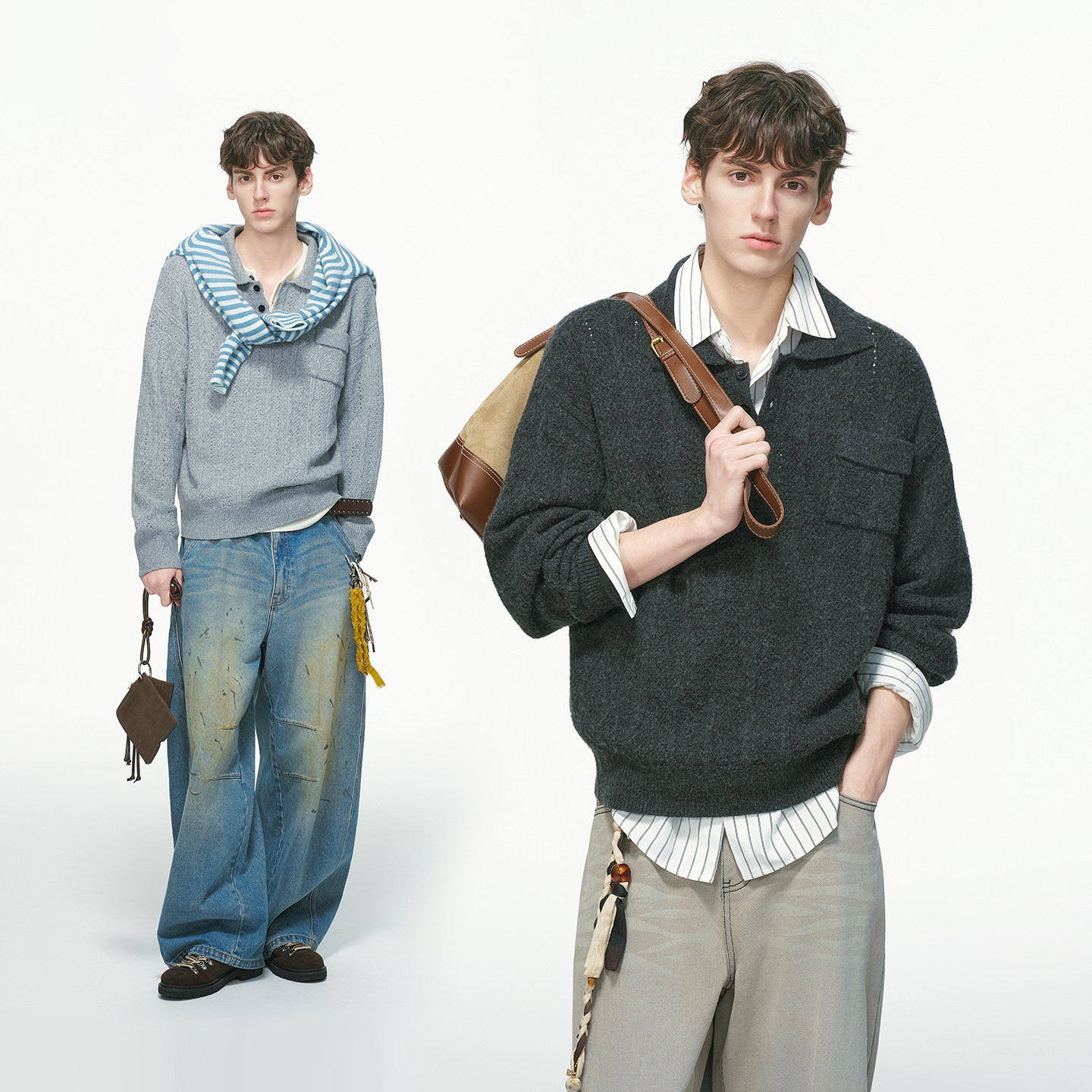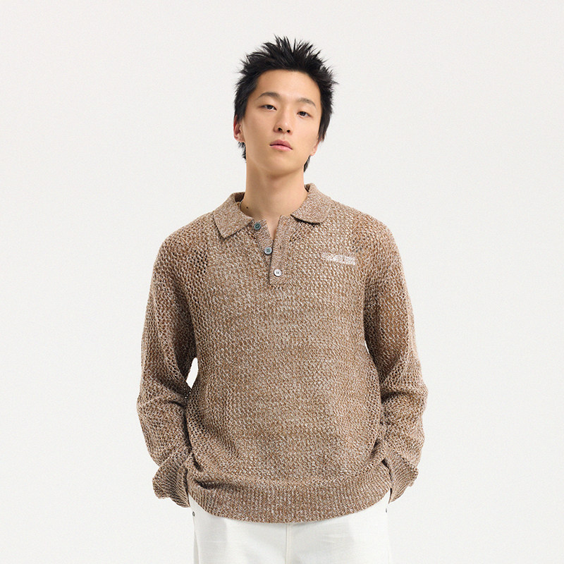 BONELESS春季2025新款polo领花纱镂空毛衣草写体宽松羊毛针织衫男