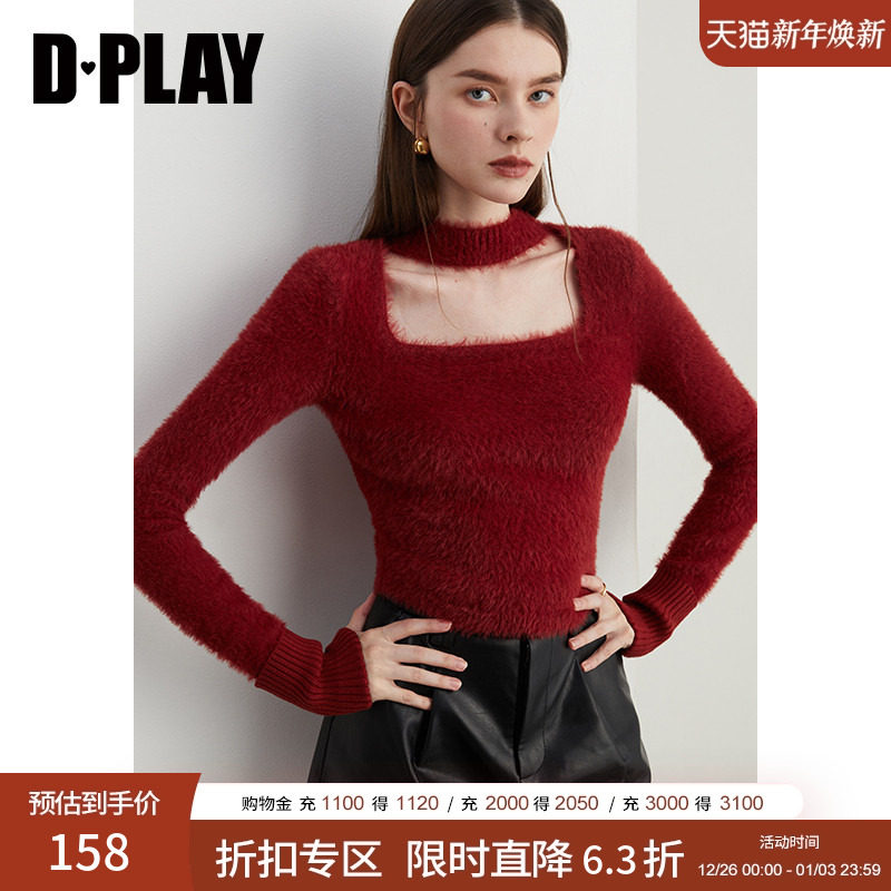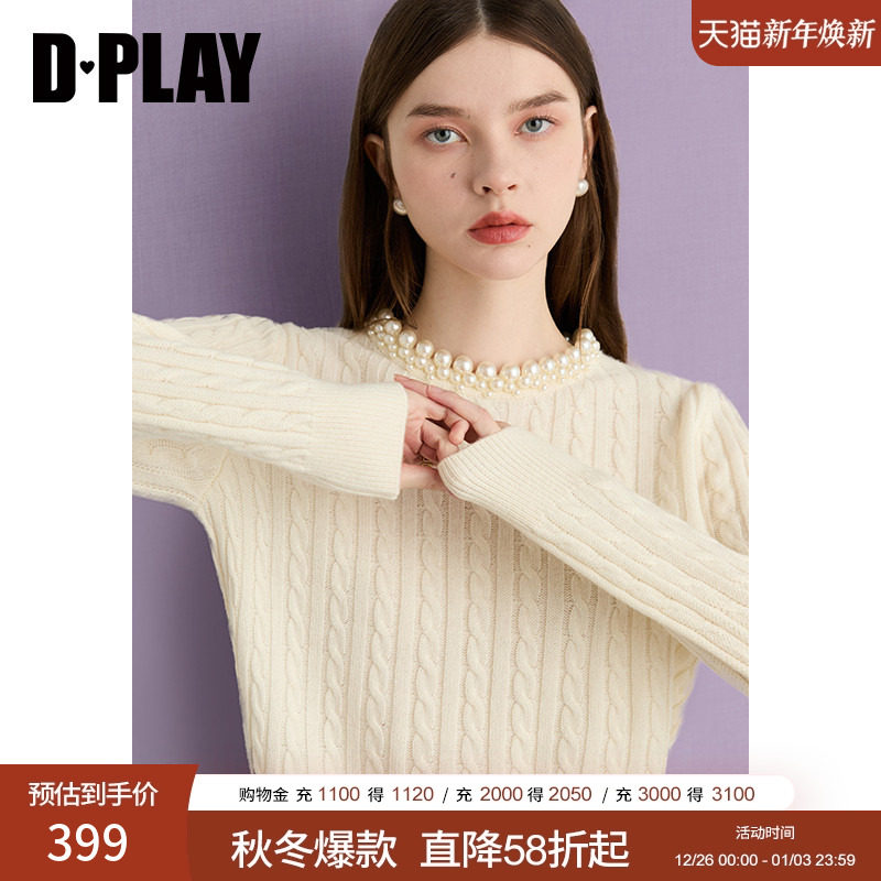 DPLAY2025年冬季新款白色圆领珍珠镂空毛衣女100绵羊毛上衣