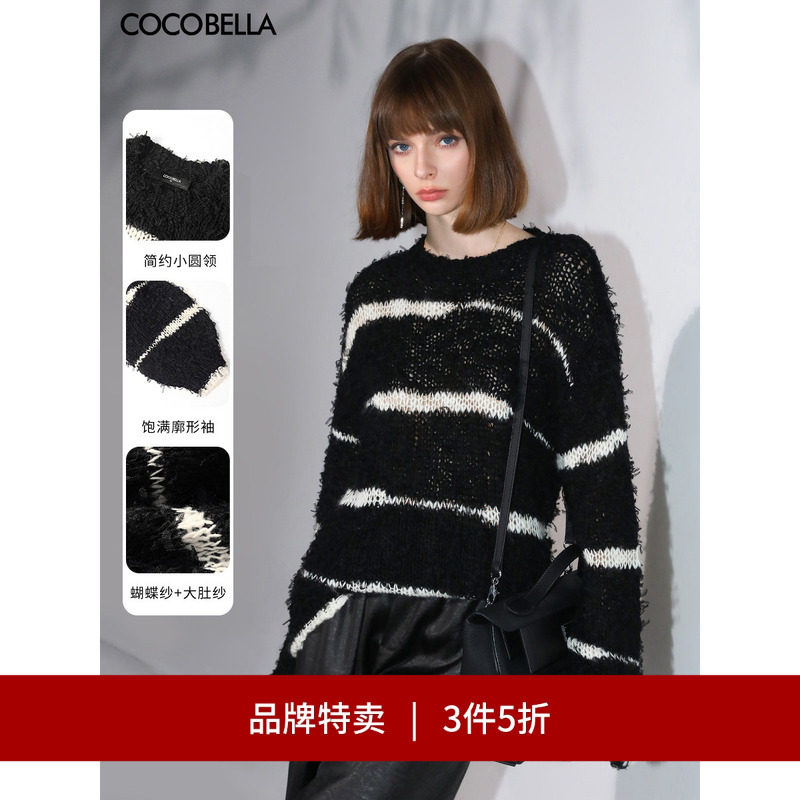 【3件5折】COCOBELLA撞色条纹镂空毛衣长毛绒花式纱针织衫MZ3020