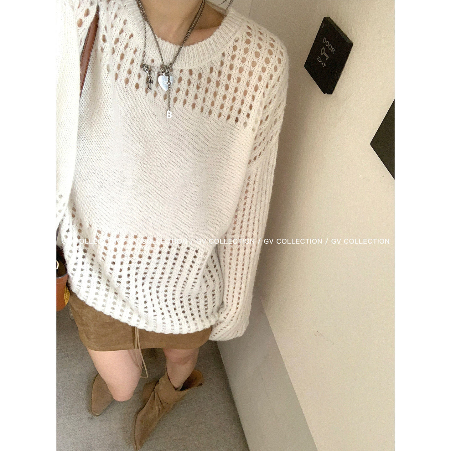 GV大白哥 清透早秋 圆领设计感镂空毛衣秋季慵懒高级感上衣女