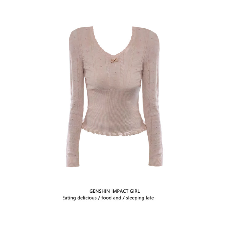 MosesQueen魔西女王镂空V领毛针织衫甜美藕粉修身温柔长袖毛衣